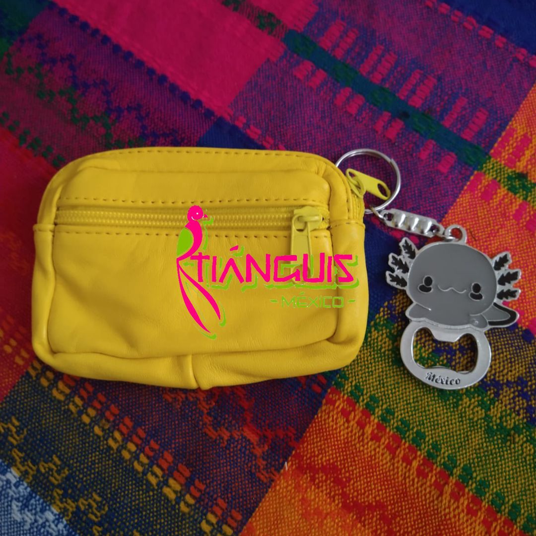 Tres en uno: Monedero de piel y llavero metálico de ajolote con destapador